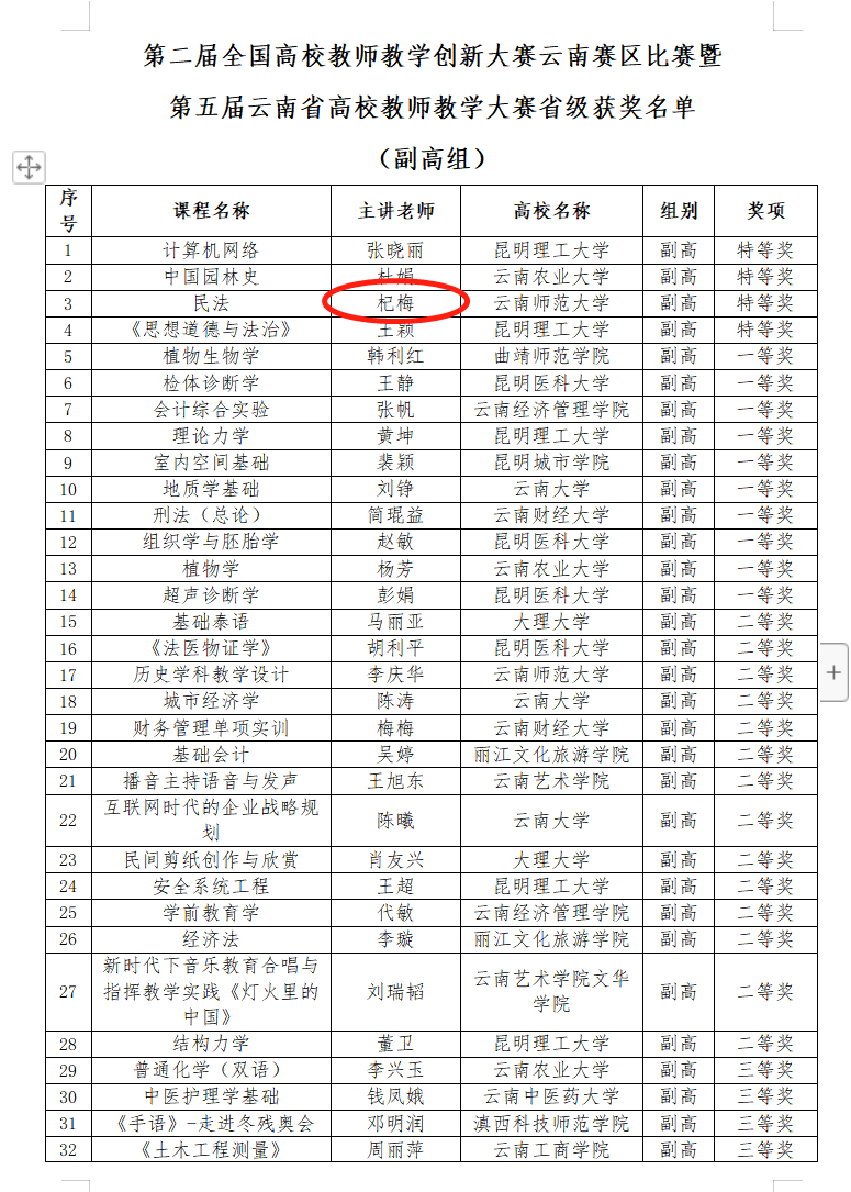 日前,k1体育杞梅副教授讲授的民法课,获得“第二届全国高校教师教学创新大赛云南赛区比赛暨第五届云南省高校教师教学大赛”省级特等奖。