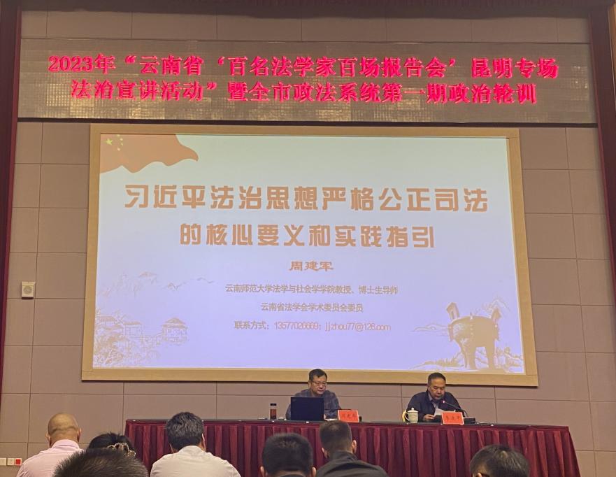 2023年9月28日,昆明市在昆明会堂举办了云南省“百名法学家百场报告会”昆明专场法治宣讲活动暨“全市政法系统第一次政治轮训”。k1体育周建军教授受邀为全市两千多名政法干警开展了“习近平法治思想严格公正司法的核心要义与实践指引”的专题讲座。