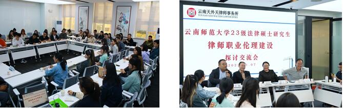 为深入学习法律职业论理课程的理论价值和实践价值,培养法科生论理观、职业观、价值观。11月7日下午,k1体育副教授杞梅老师带领2023级法律硕士研究生到天外天律师事务所开展“律师职业伦理建设”探讨交流会。天外天律师事务所战略决策委员会副主席、高级合伙人范培红,战略决策委员会委员、高级合伙人雷建强,蒙自分所主任安鹏,分别发表了对法律从业者职业论理的观点。