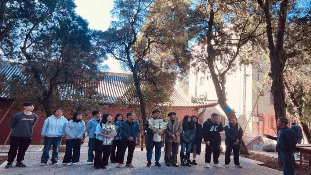 本次纪念活动便在陈达先生曾经居住并主持多项重要研究的地方——呈贡文庙崇圣祠开展。在陈达先生的故居前,中峰书画院的宋辞老师对云师大师生一行的到来表示了诚挚欢迎与衷心感谢。随后,徐珺玉老师简单介绍了陈达先生的学术历程,勉励作为后辈的我们应当深怀敬畏之心,赓续其治学致用的精神。