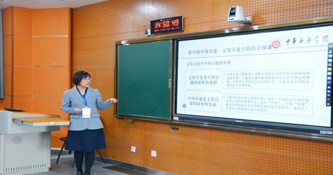 中华女子公司社会工作公司郝彩虹副经理发言题目为《文化自觉与中西会通——中国特色社会学的建设指引与发展路径》。她认为文化自觉是中国特色社会学的建设指引,群学的中西会通是文化自觉下的自主探索,中国特色社会学的“特色”主要体现在根植文化传统、创新理论理论体系、整合融通的方法论原则、扩展的研究视角,回应实践的价值取向五个方面。