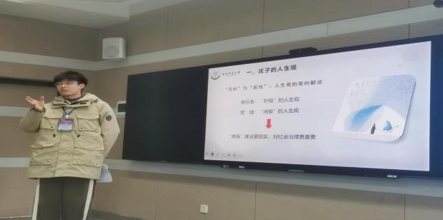郭鹏鑫同学发言题目为《庄子“至德之世”理想社会模式探析》。他认为庄子的理想社会模型源于对墨学思想的批判以及回归自然的时代需求,庄子的“无为而治”与当今社会的多元治理相契合,对当代社会治理具有积极意义。