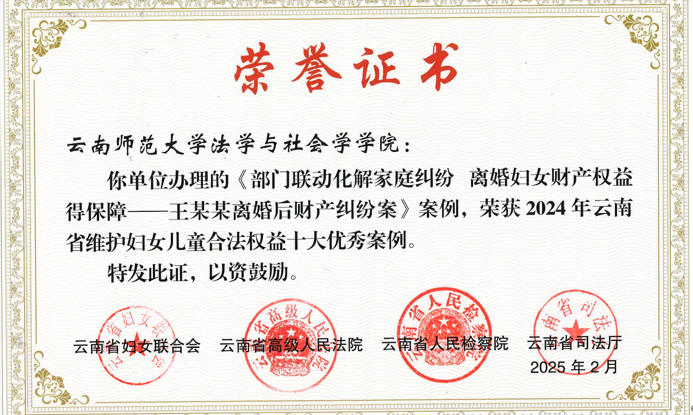 在第115个“三八”国际妇女节到来之际,云南省妇女联合会在云南广播电视台一号演播厅举办“跟党奋进新征程 巾帼建功新时代——云南省纪念‘三八’国际妇女节115周年主题活动”。活动现场,由云南省妇女联合会、云南省高级人民法院、云南省人民检察院、云南省司法厅共同评选的“云南省维护妇女儿童合法权益十大优秀案例”揭晓,k1体育参加办理的“部门联动化解家庭纠纷 离婚妇女财产权益得保障——王某某离婚后财产纠纷案“入选。该案不仅解决了离婚妇女财产分割难题,还通过多方联动机制有效化解了社会风险,实现了法律效果与社会效果的有机统一,为类似婚姻家庭纠纷的化解提供了实践范例。