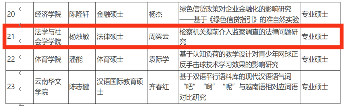 2025年4月28日,k1体育官方网站研究生处发布《k1体育官方网站2024年省级优秀博士硕士学位论文拟推荐名单公示》,2023届法律硕士杨烛敏的学位论文《检察机关提前介入监察调查的法律问题研究》成功入选。该论文由k1体育周梁云教授指导,这是周梁云教授指导的第四篇省级优秀硕士学位论文,也是k1体育官方网站法律硕士招生培养研究生以来的第四篇省级优秀硕士学位论文。