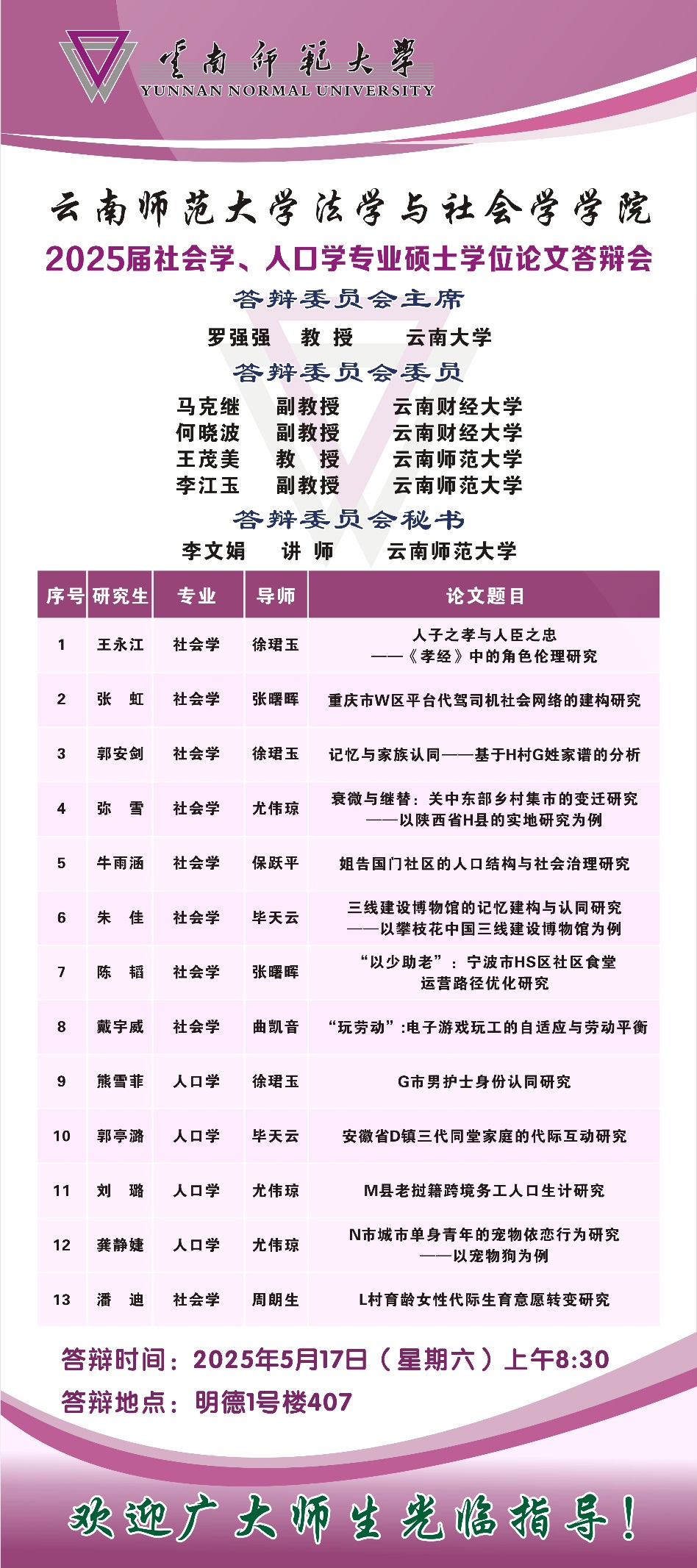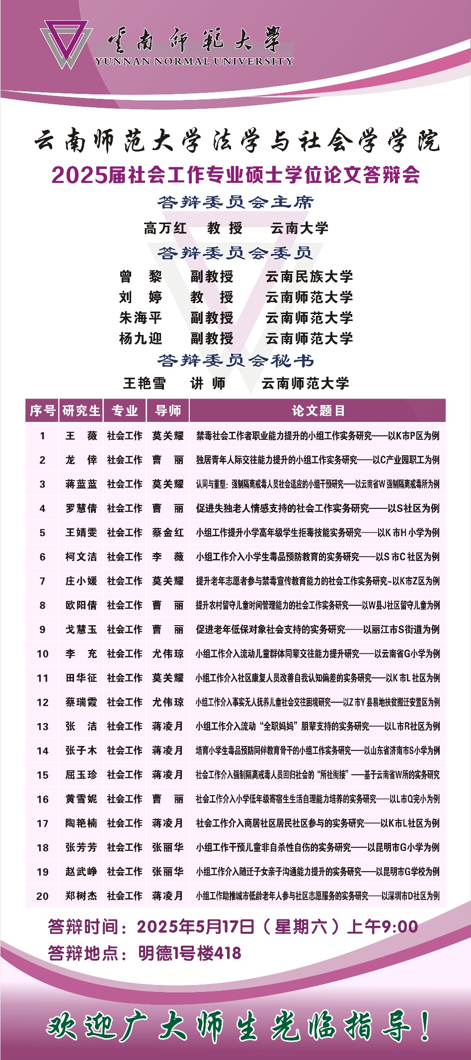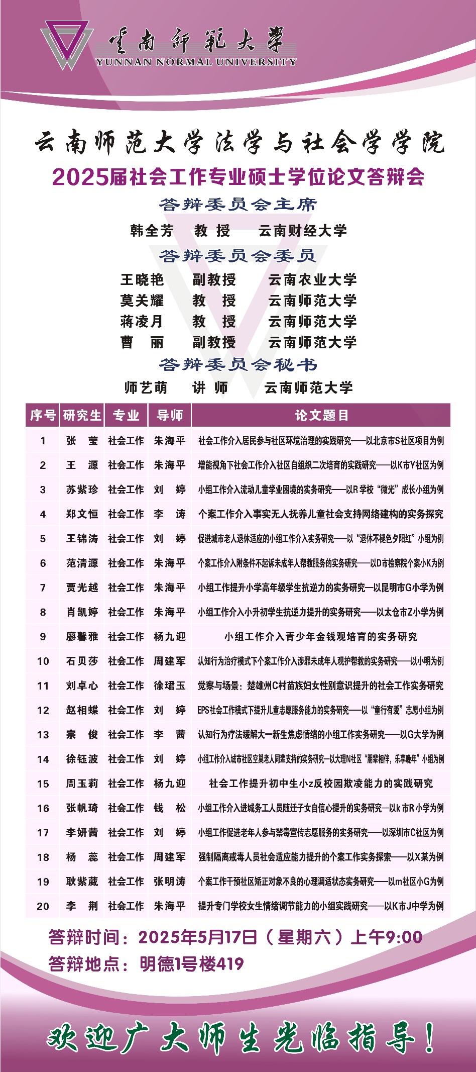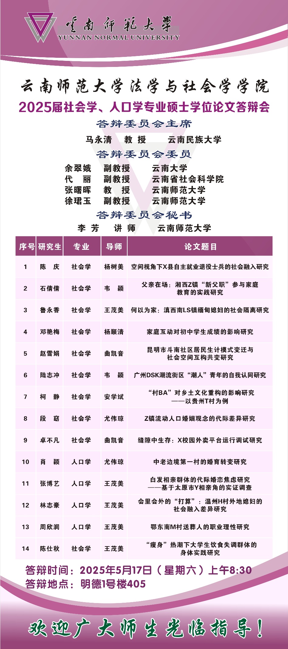2025届社会工作、社会学、人口学专业硕士学位论文答辩安排